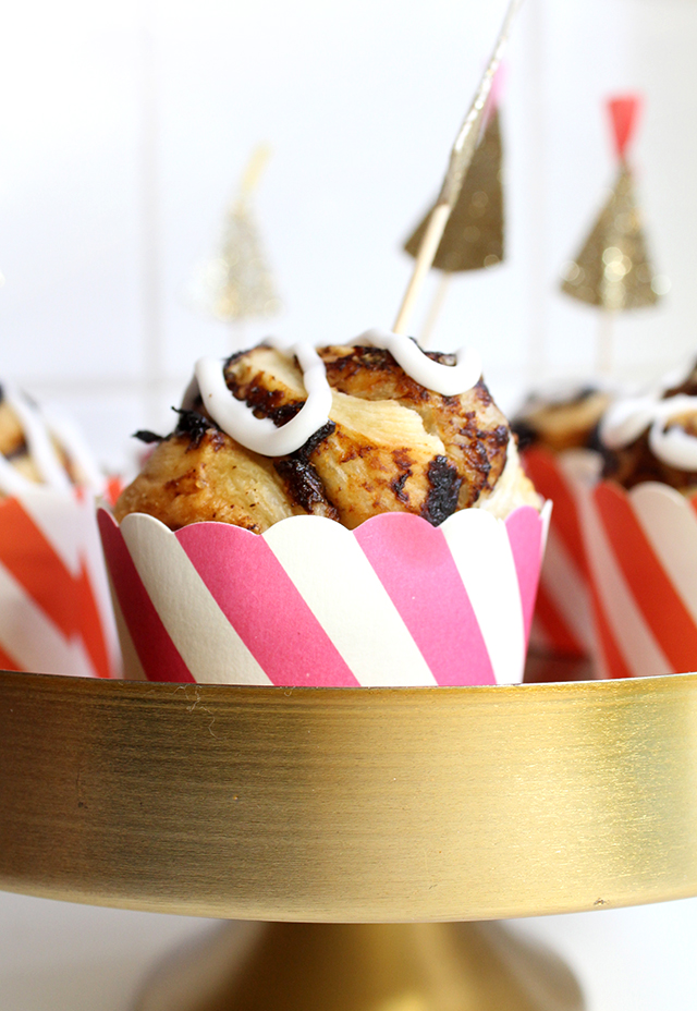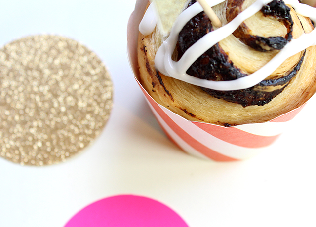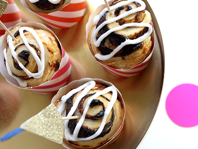 Nosta lehtitaikinalevyt sulamaan voipaperin päälle. Sivele sulaneille taikinalevyille luumuhilloa, ripottele päälle fariinisokeria ja kanelia. Kääri levyt rullalle ja kiinnitä sivu sivelemällä se vedellä. Leikkaa rulla kahtia. Aseta rullat pystyyn kuppikakkuvuokiin. Paista 200 °C uunin keskitasolla noin 20 minuuttia. Koristele.