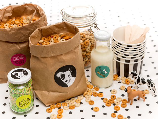 Kaada murot lasipurkkeihin tai paperipusseihin, jotka voit koristella erilaisilla tarroilla. Koiramaiset kemut -teeman 40 mm tarroista löytyy mm. hauskoja tarroja tähän käyttöön. Kaada maito lasipurkkeihin tai kannuun. Asettele murot, strösselit ja maito buffetmaisesti esille. Muista kauhat tai lusikat muroille! Me käytimme murobuffetin kulhoina näitä ihania raidallisia jäätelökulhoja.