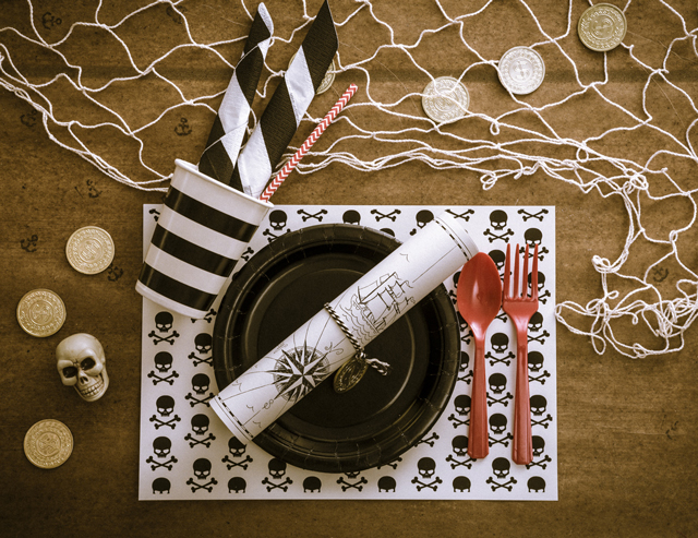 Näyttävä kattaus on helppo toteuttaa teemapaperin ja kertakäyttöastioiden avulla. Leikittele väreillä tai valitse tyylikäs mustavalkoinen kattaus. Merirosvo -teemapaperin toisella puolella on jännittävä merirosvokartta, jonka jokainen juhlavieras saa värittää mieleisekseen. Karttaa voi myös käyttää apunaan aarrejahdissa. Kartan kääntöpuolella toistuu pääkallokuvio.