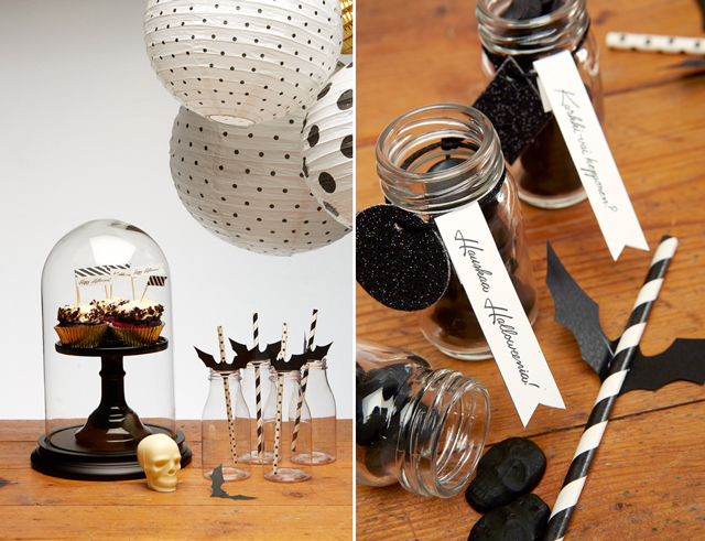 Halloween juhla kuuluu myös aikuisille! Pimeneviin iltoihin on kiva totutella isommalla porukalla. Naamiaiset, illanistujaiset tai vaikka illallinen pitkän kaavan mukaan kerää ystävät yhteen. Mustavalkoinen halloween -tyyli taipuu moneen. Satsaa nyt muutamiin näyttäviin paperikoristeisiin ja hyödynnä Pop up kemujen ladattavat ja tulostettavat Halloween -diyt.