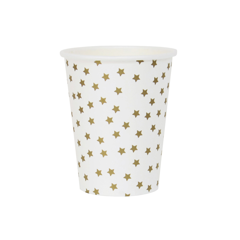 8 kpl paperimukeja kultaisilla tähdillä. Mukin korkeus on 9 cm.