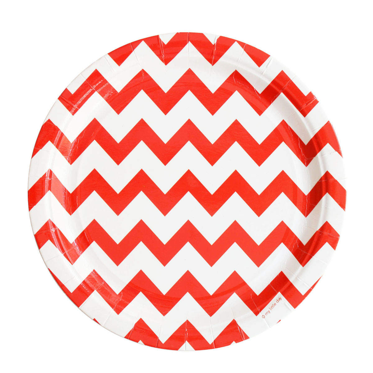 8 kpl paperilautasia punaisella chevron-kuviolla.