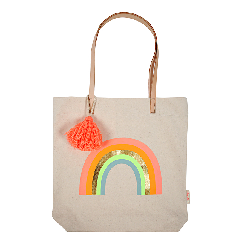 Ihana Rainbow -kangaskassi paksua canvasta. Sateenkaaripainatus, nahkaiset hihnat ja upea neonvärinen tupsukoriste tekevät tästä laukusta täydellisimmän kangaskassin ikinä.