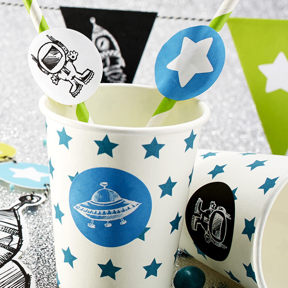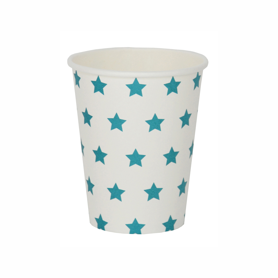 Tähtihetkiä kemujen kattaukseen suloisilla paperimukeilla. Mukin korkeus on 9 cm.