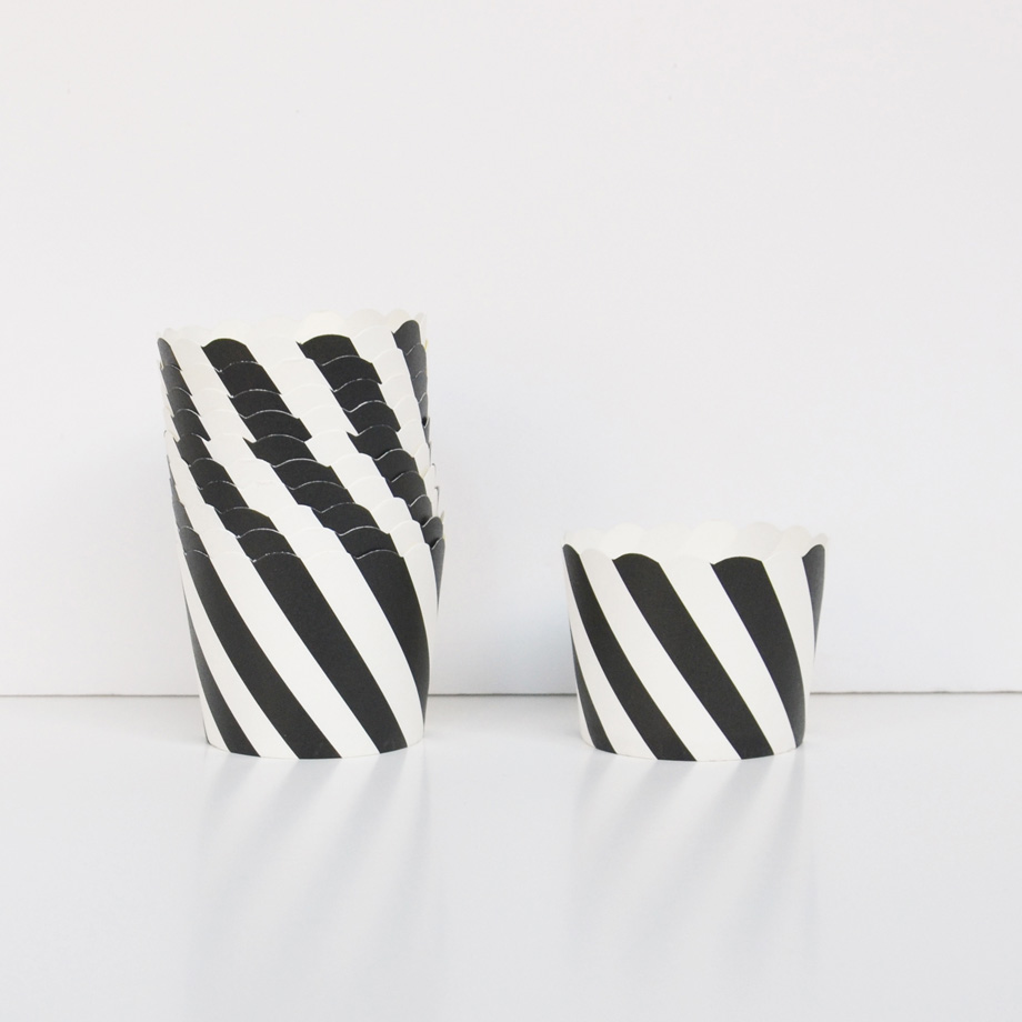 Muffinssivuokaa leivontaan ja kattaukseen. 25 kpl mustavalkodiagonaaliraidallista paperivuokaa.