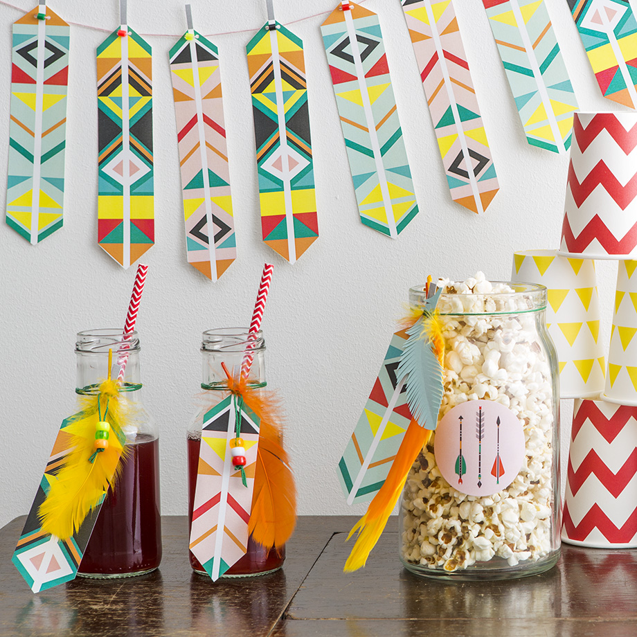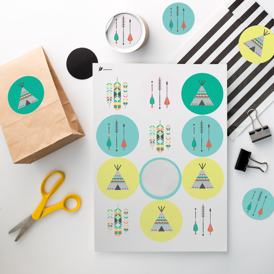 Intiaani-teeman tarra-arkki. Yhdellä A4-kokoisella arkilla on 12 kpl halkaisijaltaan 60 mm kokoisia ympyrän muotoisia tarroja.