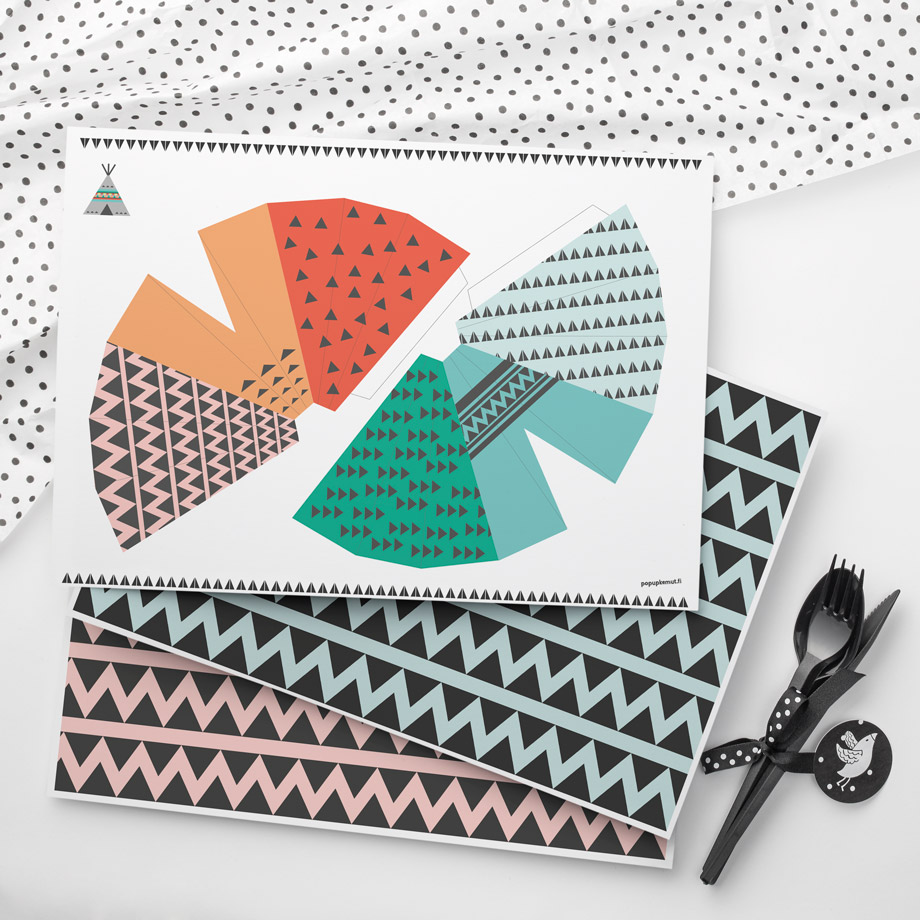 Intiaani -teeman kaksipuoleinen teemapaperi/tabletti. Teemapaperin toisella puolella on taiteltavat tiipiit ja toisella puolella teemaan sopiva tabletti. Myyntierä 8 kpl. 160 g/m2 myrkytön design-paperi.