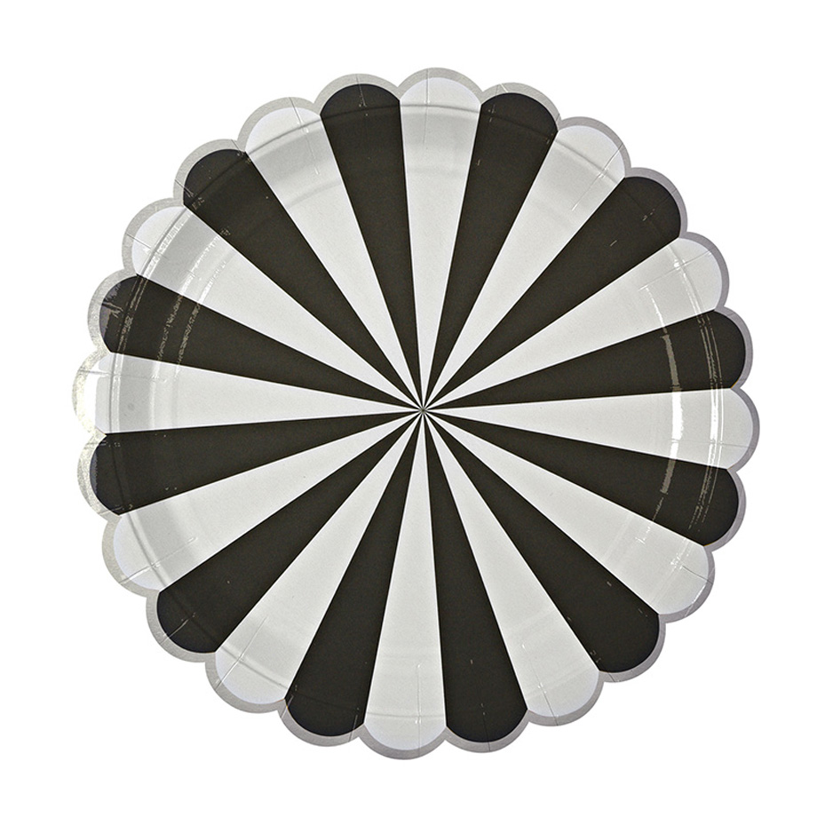 8 kpl paperilautasia mustilla raidoilla ja hopean värisellä piparireunuksella.