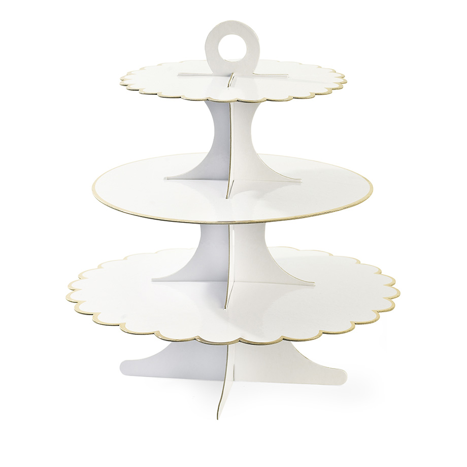 Valkoinen kaunis kolmikerroksinen pahvinen kuppikakkuvuokateline. Ylin kerros 20 cm ø, keskikerros 25 cm ø ja alin kerros 30 cm ø. Ylimmässä ja alimmassa kerroksessa piparkakkureunus.