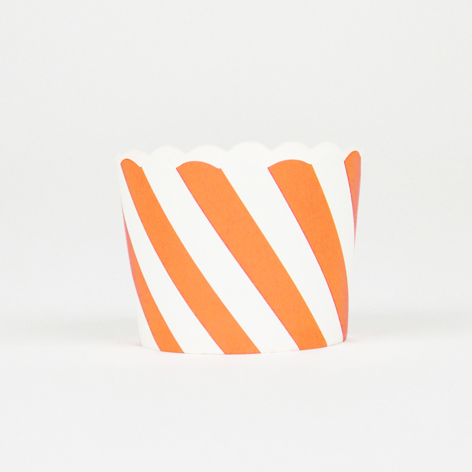 Muffinssivuokaa leivontaan ja kattaukseen. 25 kpl oranssivalkodiagonaaliraidallista paperivuokaa.