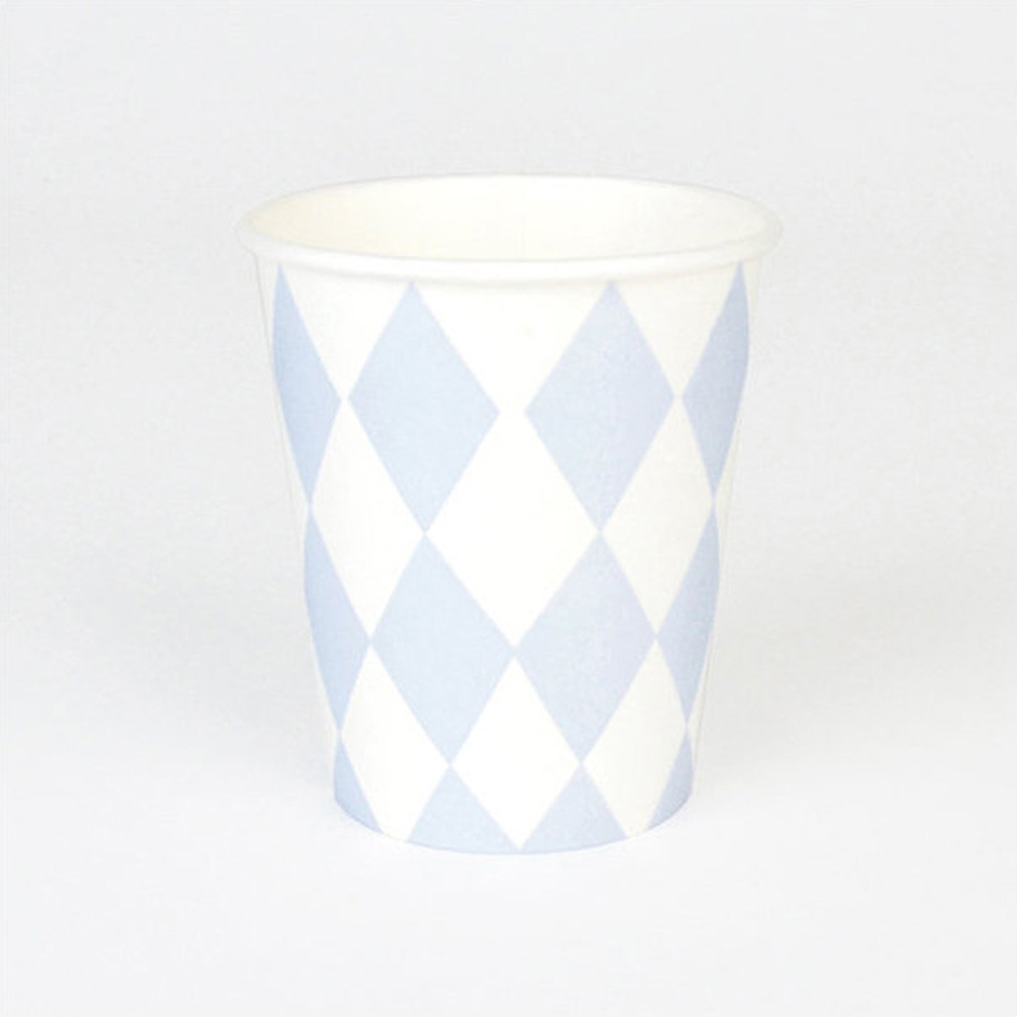8 kpl paperimukeja vaaleansinisellä salmiakkikuvioinnilla. Mukin korkeus on 9 cm.