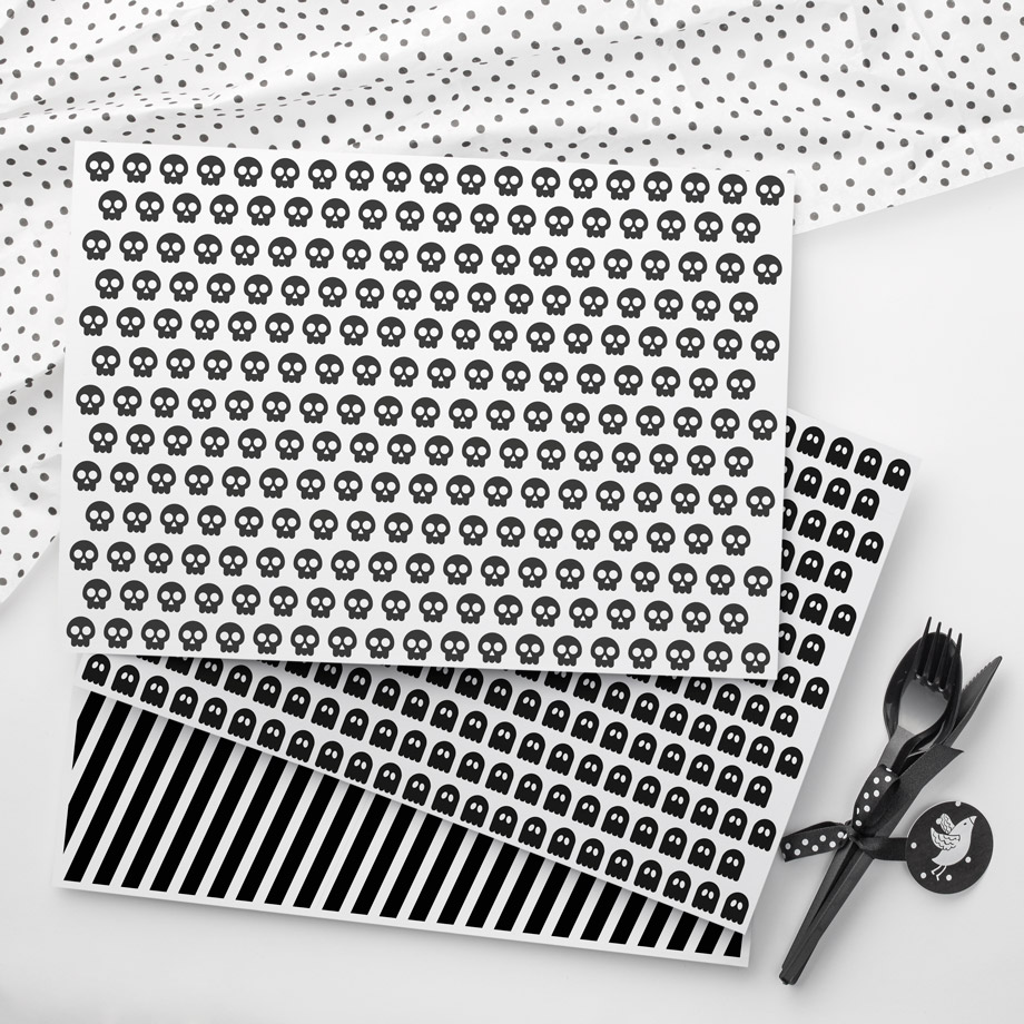 Hauska halloween-teemapaperi kauden askarteluihin ja juhakattauksiin. Teemapaperin toisella puolella on aina mustavalkoista vinoraitaa ja toisella puolella pääkallot tai kummitukset.