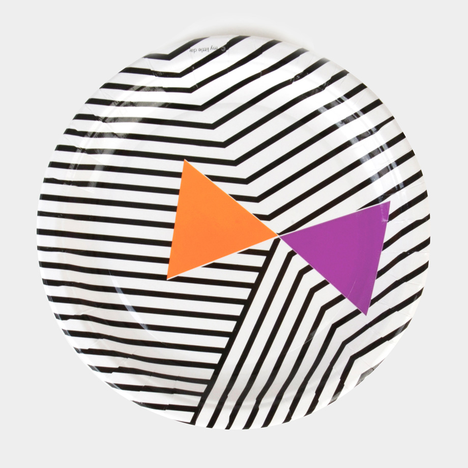 8 kpl mustavalkodiagonaaliraidallisia paperimukeja, joissa oranssin ja lilan värinen suuri rusetti.