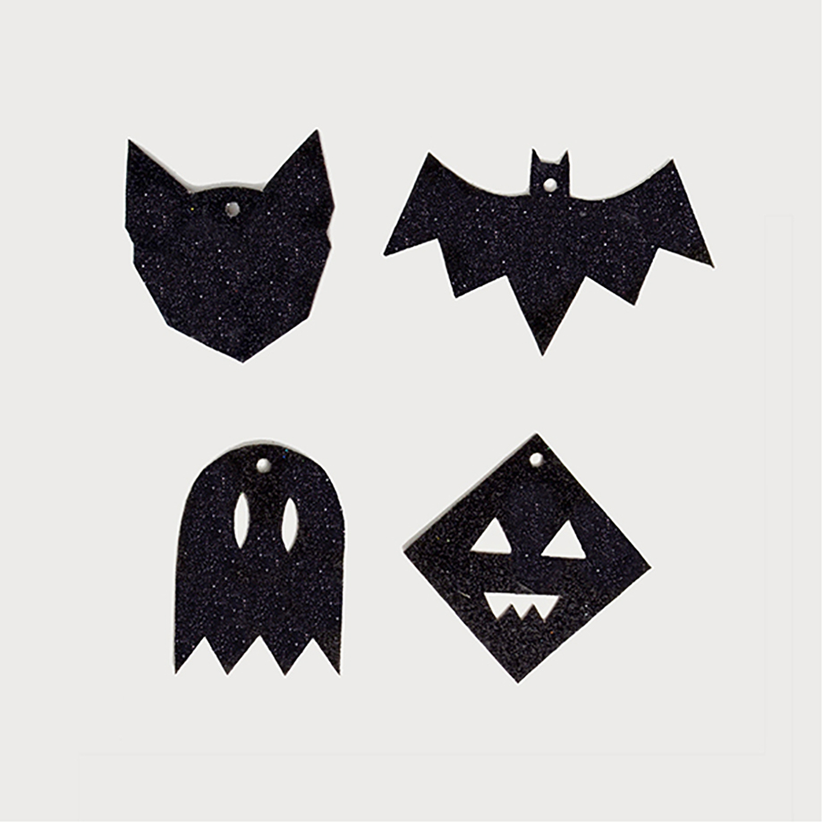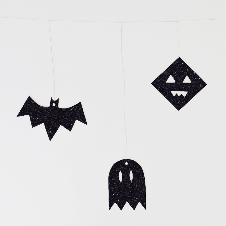 Upea 6 metriä pitkä Halloween-koristenauha, jossa 12 mustasta glitter-kartongista valmistettua Halloween-koristetta. Nauhassa on neljää erilaista koristetta.