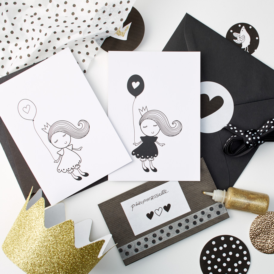 Pikkuprinsessa-aiheinen kutskukortti postikorttikoossa.Toisella puolella korttia postikorttiviivasto.