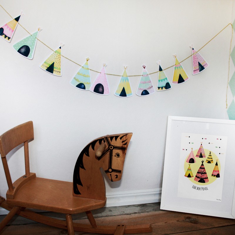 Ihana 2 metriä pitkä viirinauha, jossa on kymmenen uniikkia tiipiitä kultanauhassa. Yhden tiipiin koko on 8 × 14 cm. Viirinauha sopii juhlaan, lahjaksi tai lastenhuoneen sisustukseen